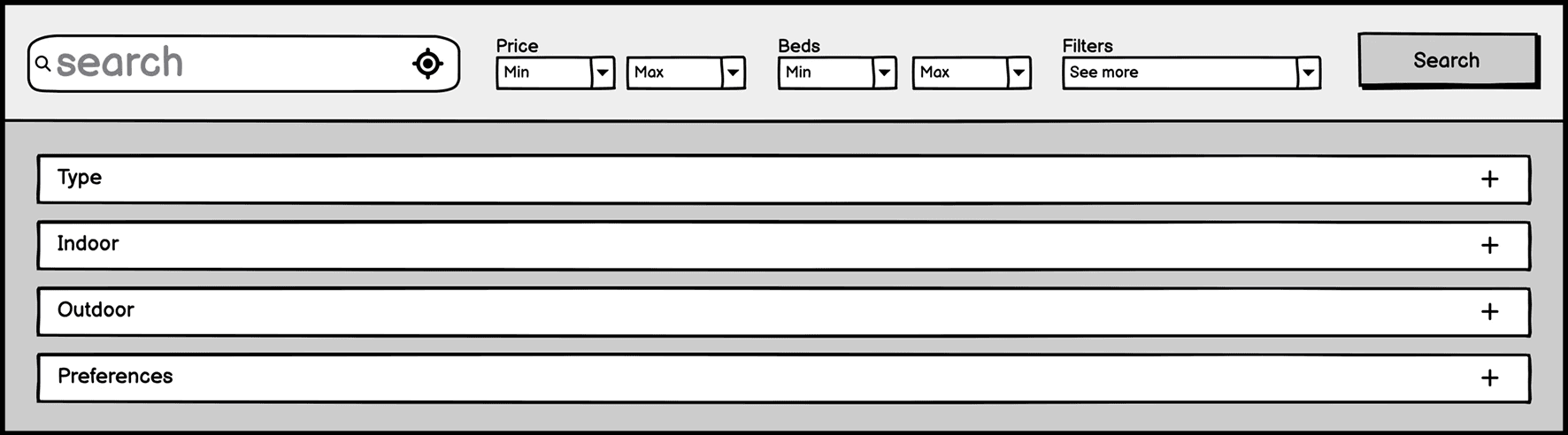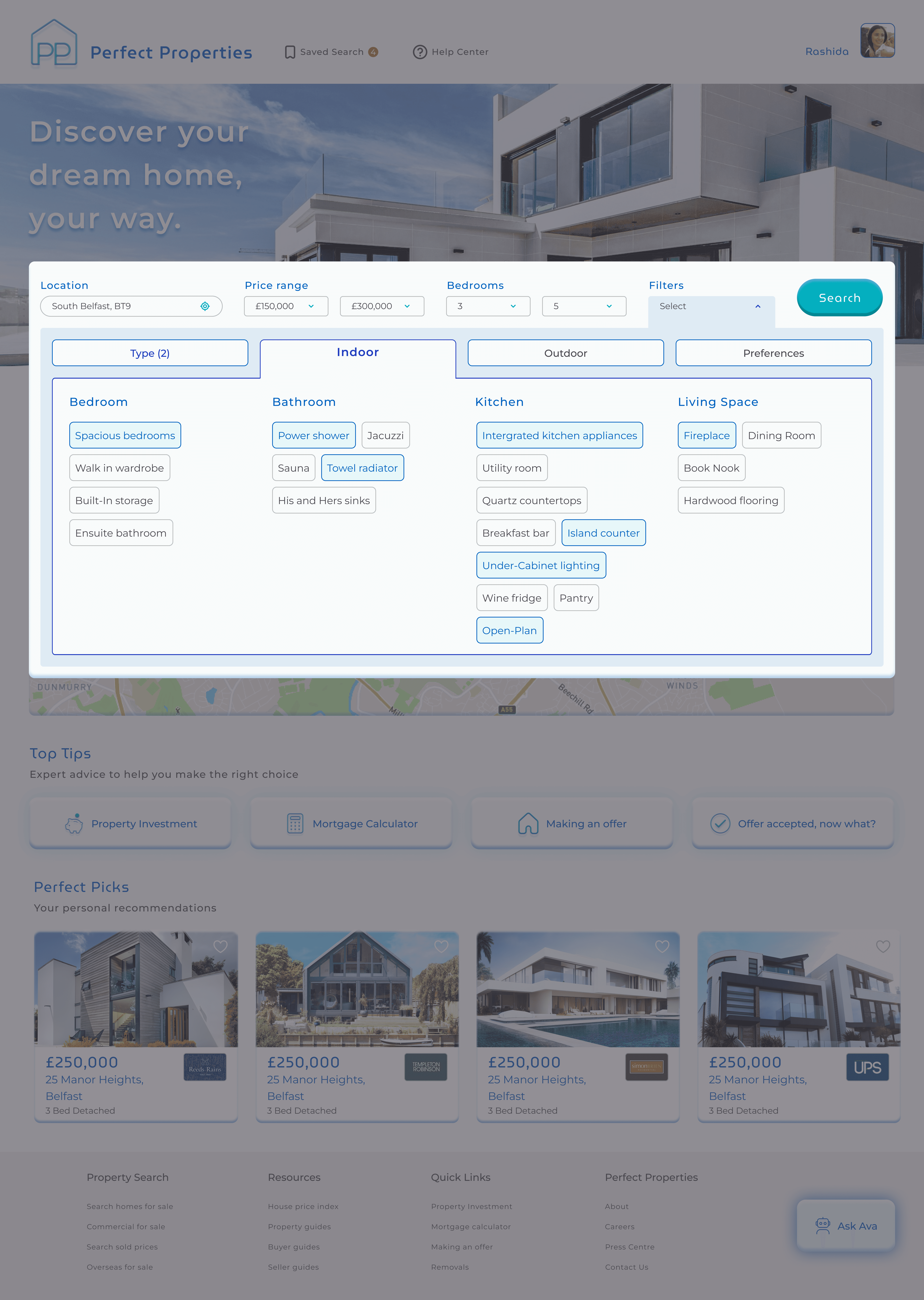 I looked at mega menu, accordion and a tabbed layout to house filters, in order to decide which one would reduce visual clutter, provide clarity and afford clean scalability. I felt tabs aligned with Perfect Properties brand guidelines of being clean, quick, and smart. Preference testing further validated that the tabbed design felt most intuitive and least visually overwhelming to users.