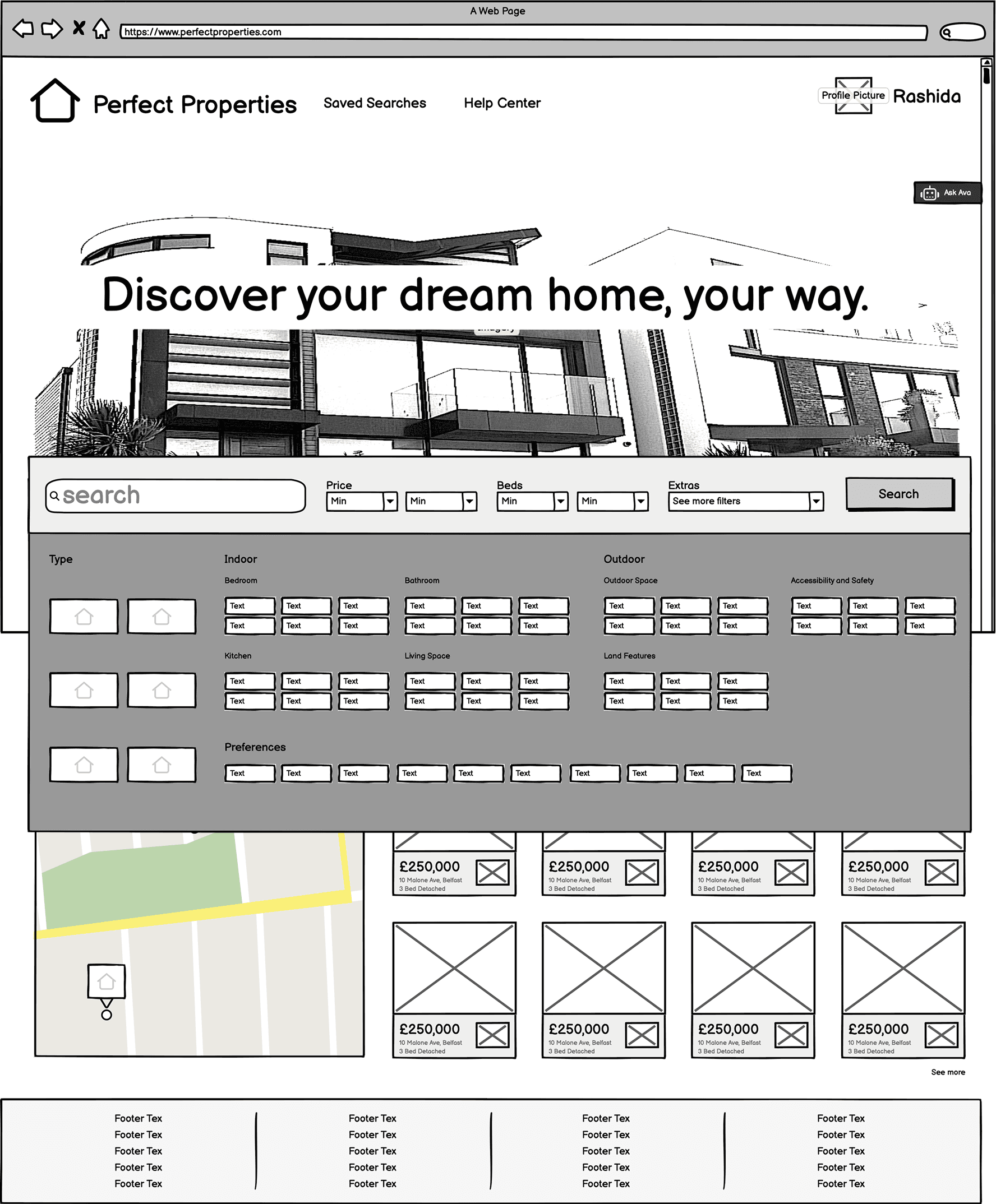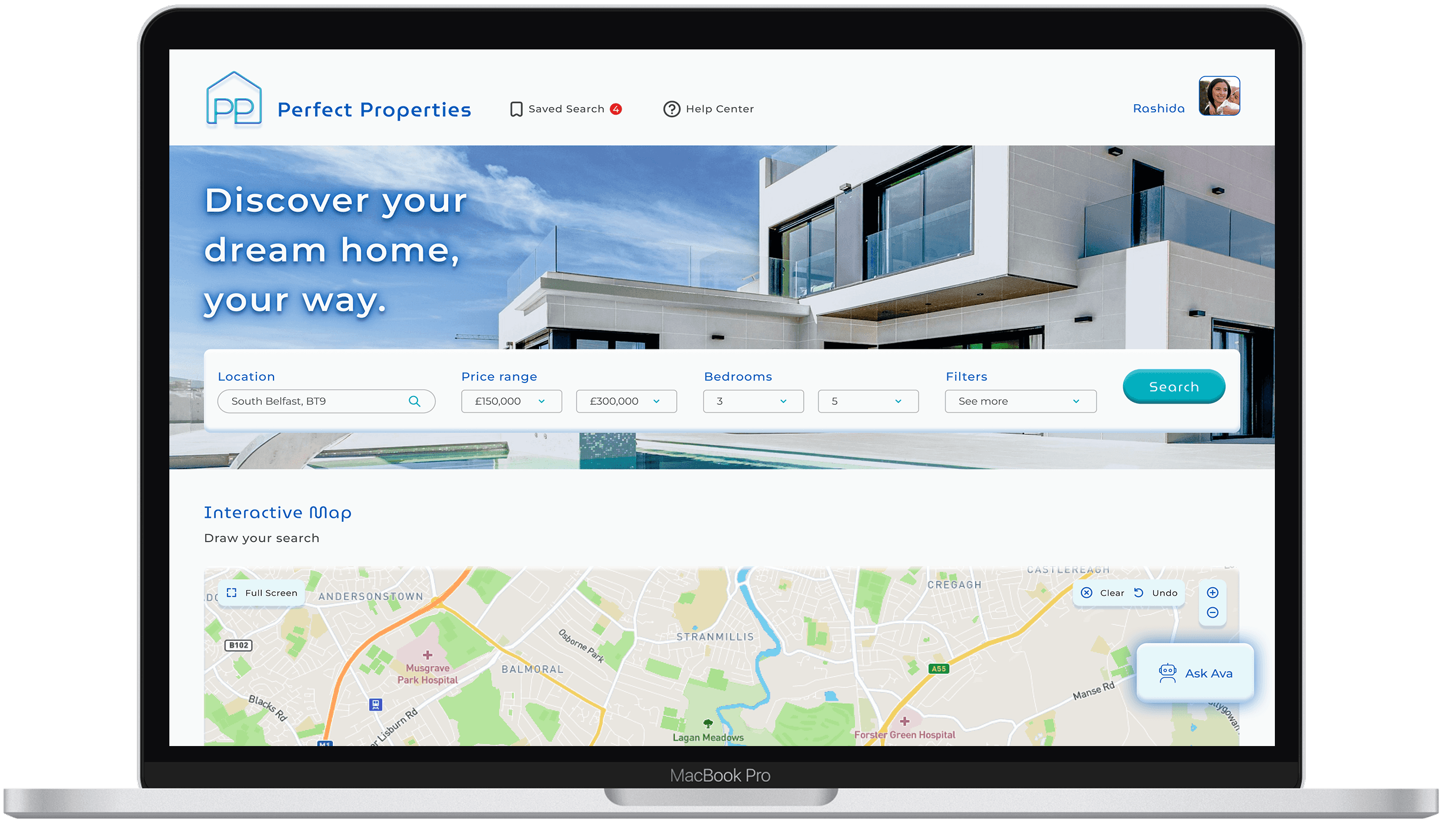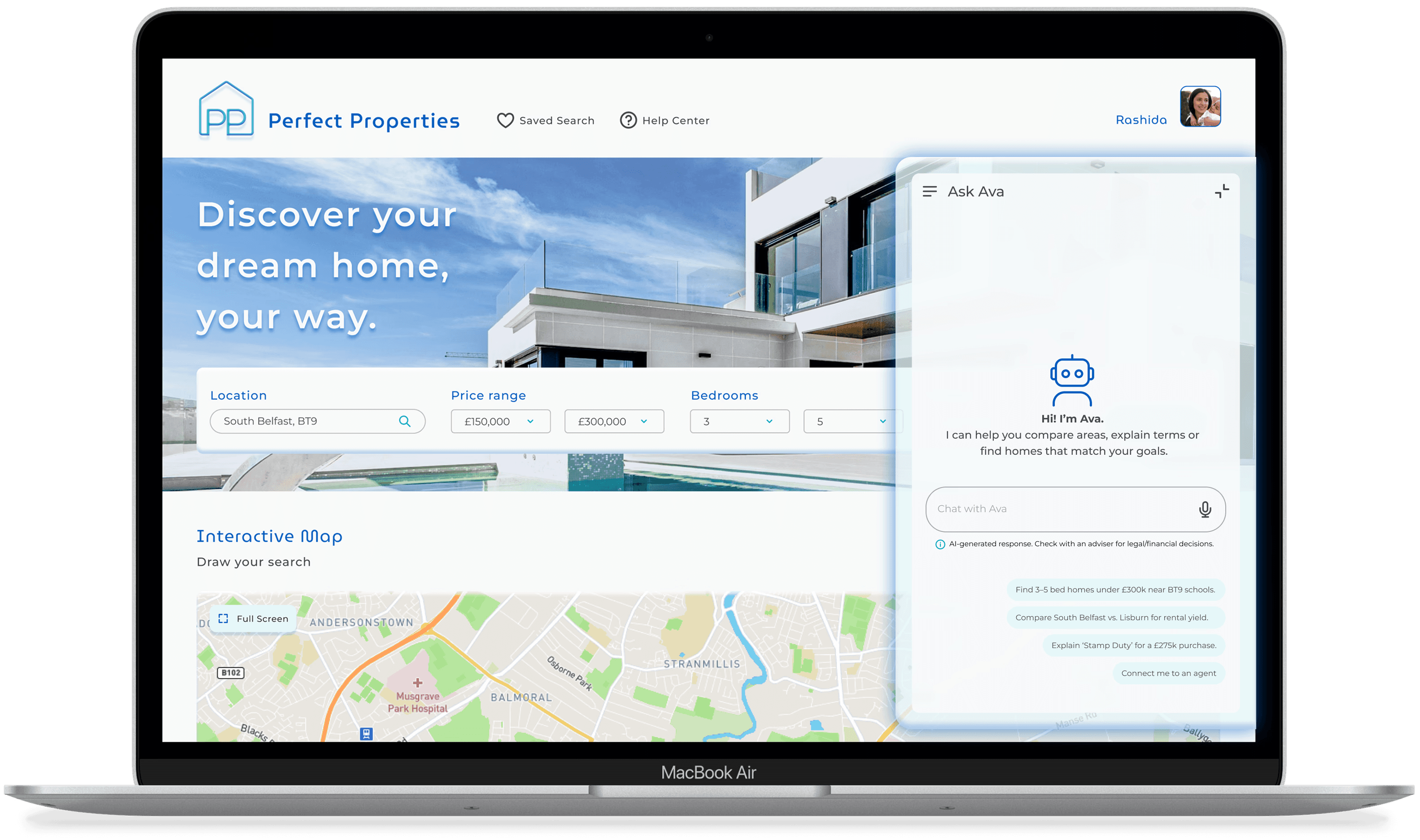 First time property investors want to make smart decisions but property searches are often overwhelming and leave people with unanswered questions . Perfect Properties reimagines the process through a user-first lens with clean design, AI support and an interactive map for a visual search experience.