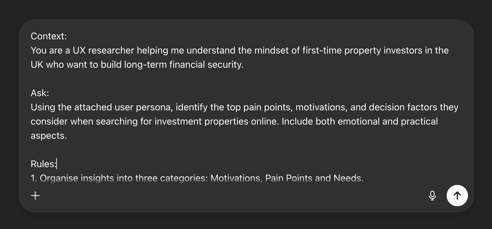 I had brand guidelines, one persona and was asked to start straight into the UI design. However I needed more information to truly understand what first time property investors needed from this design. To gain insight quickly, I conducted research on ChatGPT and used the CARE (Context, Ask, Rules, Example) framework to enginer my prompt. I looked up the top 2 competitors, performed heuristic evalutions on their UI to ensure I didnt make the same mistakes and looked for a gap in the market by analysising their user reviews.