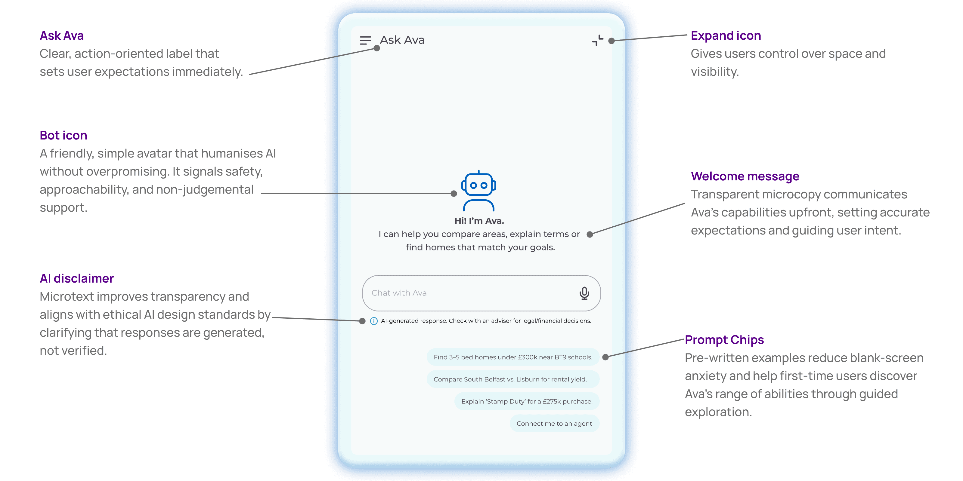Users connect with AI when it feels safe, clear, and helpful. They need to understand what AI can and can’t do. Every design decision, from microcopy to visual tone, shapes trust. This project strengthened my confidence in designing ethical, accessible, and human-centred AI interactions.