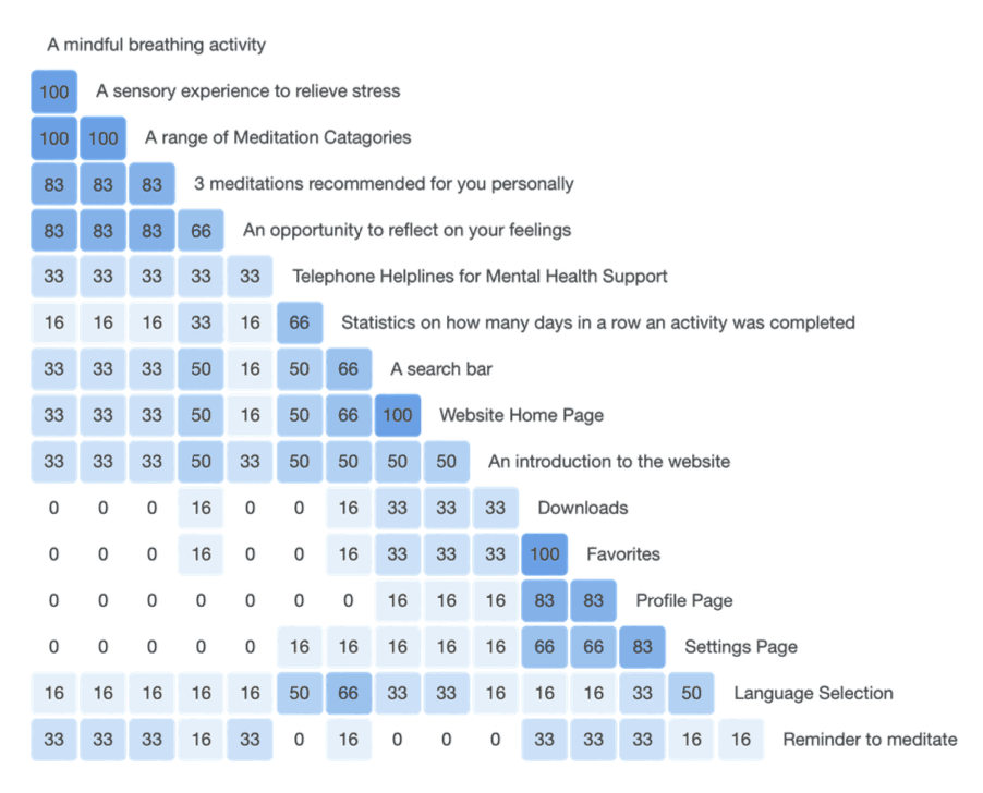 The majority of participants grouped meditations, helplines, run streak and search as features they would associate with the home screen. As a result, I followed this exact hierachy when designing the home screen.